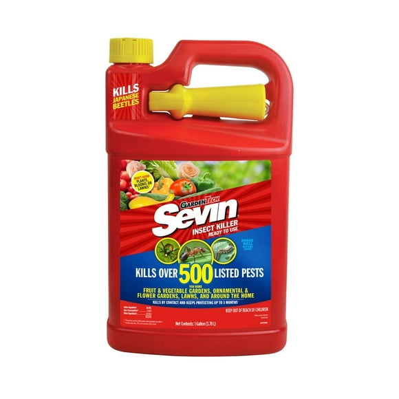 Garden Tech Sevin Liquid ready-to-use insect killer. Starts killing insects immediately upon contact. Kills over 500 listed pests on vegetables fruits ornamentals lawns and around the home perimeter Formulated to protect over 250 vegetables and fruits Can be used up to one day of harvesting on tomatoes peppers berries grapes leafy vegetables and more listed on the label Kills common household bugs such as ants roaches and spiders outside before they come.
